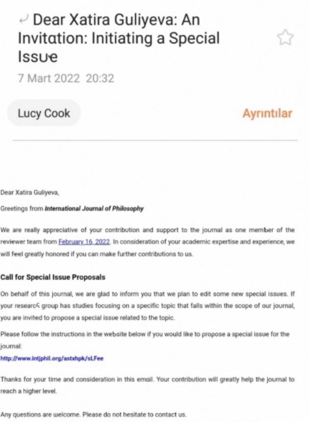 AZƏRTAC xəbər verir ki, bununla bağlı müxtəlif elm sahələri üzrə 400-dən çox jurnalı nəşr edən “Science Publishing Group” azərbaycanlı filosofa məktub göndərib. Məktubda Xatirə Quliyevanın “Dünya süni intellekt sisteminin inkişafında Lütfi Zadə fenomeni” başlıqlı məqaləsinin onlarda ciddi maraq doğurduğu bildirilib. Alim jurnalın bir nömrəsinin onun redaktorluğu ilə çap olunması məqsədilə yeni elmi layihədə iştirak etməyə dəvət olunub.