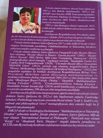 Kitablar 05 ноя 2025, 18:14AMEA-nın Fəlsəfə və Sosiologiya İnstitutunun Multikulturalizm və tolerantlıq fəlsəfəsi şöbəsinin müdiri, fəlsəfə elmləri doktoru Xatirə Quliyevanın “Şuşa Bəyannaməsi - birlik və həmrəylik fəlsəfəsi” kitabı çapdan çıxıb. Kitab Ulu Öndər Heydər Əliyevin anadan olmasının 100-cü ildönümünə həsr edilib.