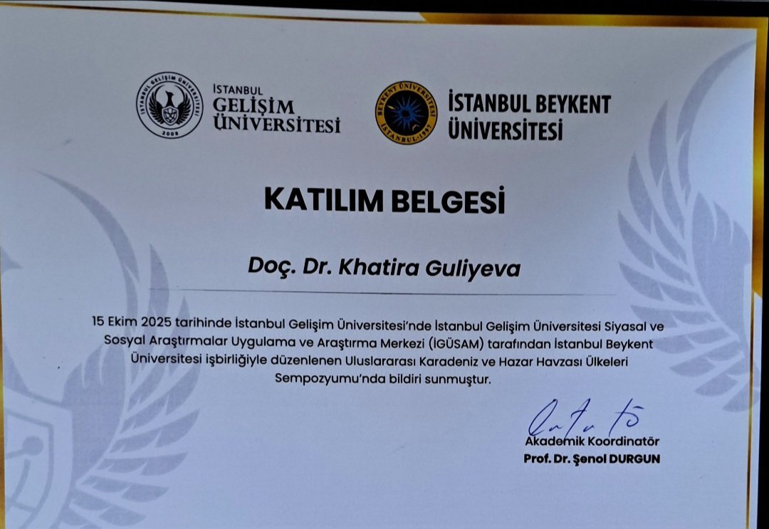 Konfranslar 05 ноя 2025, 11:39AMEA əməkdaşları Türkiyənin İstanbul Gelişim və Beykent Universitetlərinin birgə təşkilatçılığı ilə İstanbul Gelişim Universitetində keçirilmiş “Qara dəniz və Xəzər hövzəsi ölkələri: Qara dəniz və Xəzər hövzəsində sabitlik axtarışı” adlı beynəlxalq simpoziumunda iştirak ediblər.
